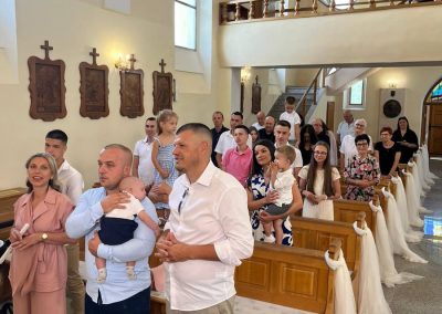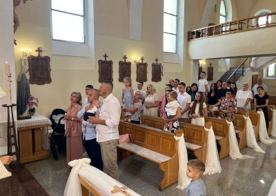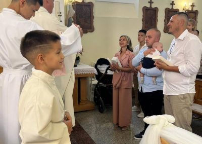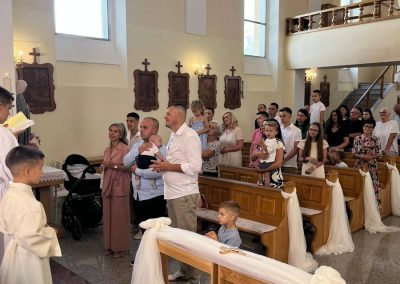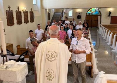U crkvi se prije krsnog slavlja okupila velika rodbina i prijatelji i s jedne i s druge strane, zatim su se roditelji i kum ispovijedili, a onda je slijedilo svečano krštenje maloga Mateja, kojega je držao na krštenju kum Ivan Sesar. Župnik je na početku krsnoga slavlja sve srdačno pozdravio i izrazio veliku radost ne samo za bračni par Škobić i njihovu obitelj, nego i za čitavu župu i Katoličku Crkvu i naš hrvatski narod, jer rastemo za jednog člana više, a evo danas osmeročlane obitelji Škobić koja slavi po šesti put krštenje svoje djece. Tako su do sada krstili jednu kći Anu i pet sinova Marka, Josipa, Nikolu, Ivana i evo danas Mateja. Bogu hvala na ovom velikom daru. Za vrijeme krsnog slavlja uz roditelje i kuma pričestilo se i puno ostaloga svijeta, a na kraju su slijedila i fotografiranja, da ovaj dan ostane zabilježen i za pamćenje.