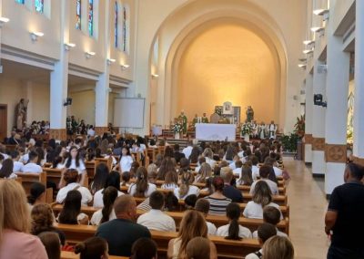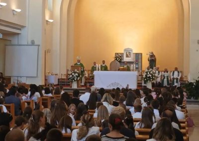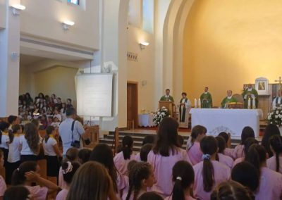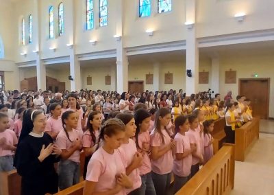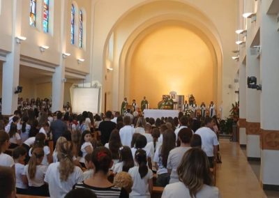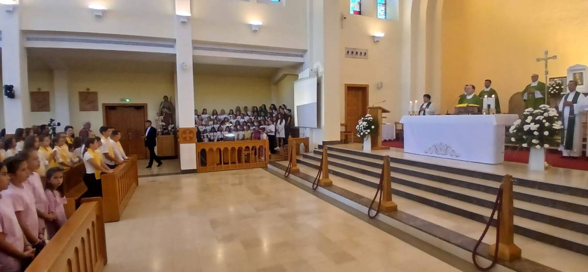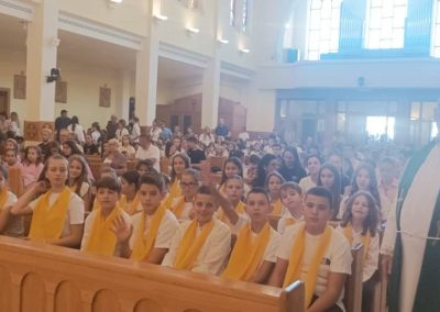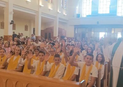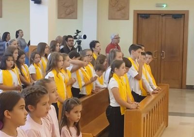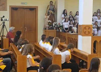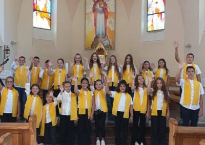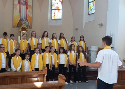 U 13,00 sati bile su tonske probe u istoj dvorani, a u 14,00 sati slavljena je sv. Misa u župnoj crkvi, koju je predslavio biskup Petar u koncelebraciji svećenika župnika Dječjih zborova. Biskup je uputio i prikladnu propovijed o važnosti crkvenoga pjevanja i aktivnosti djece u svojim župama. Na ovom susretu sudjelovala su djeca iz 14 hercegovačkih župa u 15 Dječjih zborova, među kojima je bila i naša bjelopoljska župa s Dječjim župnim zborom.